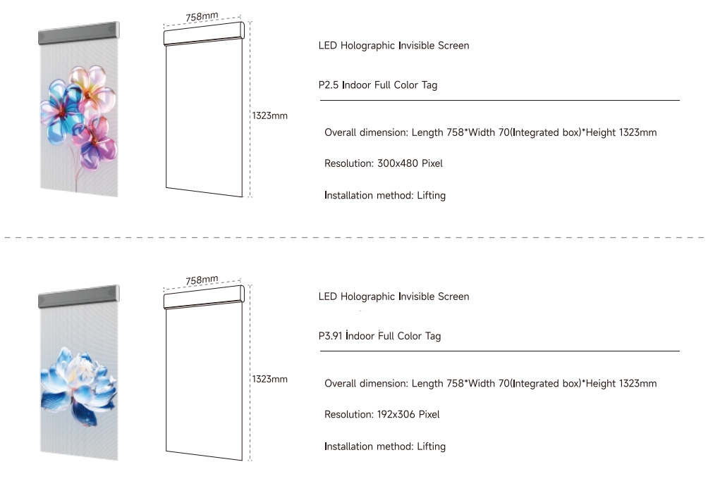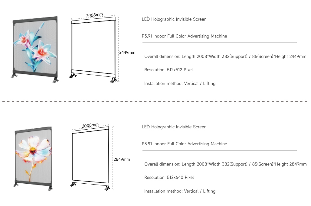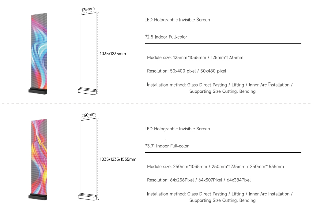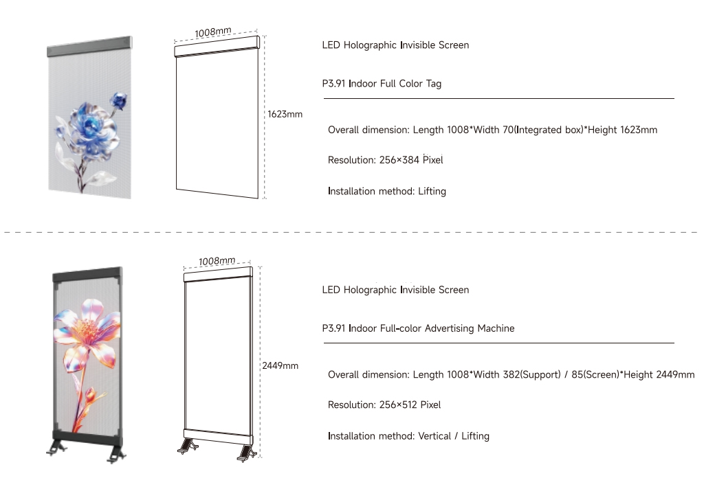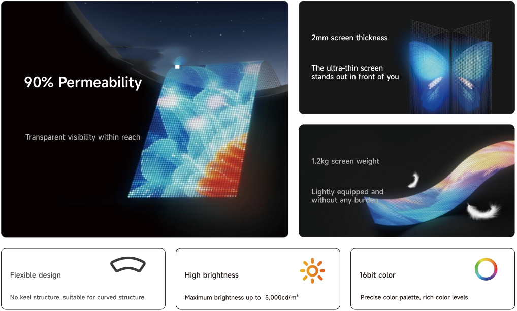 The overall structure is fixed without frame, and the lamp board is made of PCB board with a hollow mesh circuit on the surface. The thickness of the screen is less than 2mm, light and thin, and can be bent and cut. it is flexible and skillful to use, seamlessly integrated when mounted on transparent glass. Adopting self-developed chips with strong driving performance, coupled with high-quality materials and high standard craftsmanship, the sensory permeability of the entire series of products can reach over 80%.